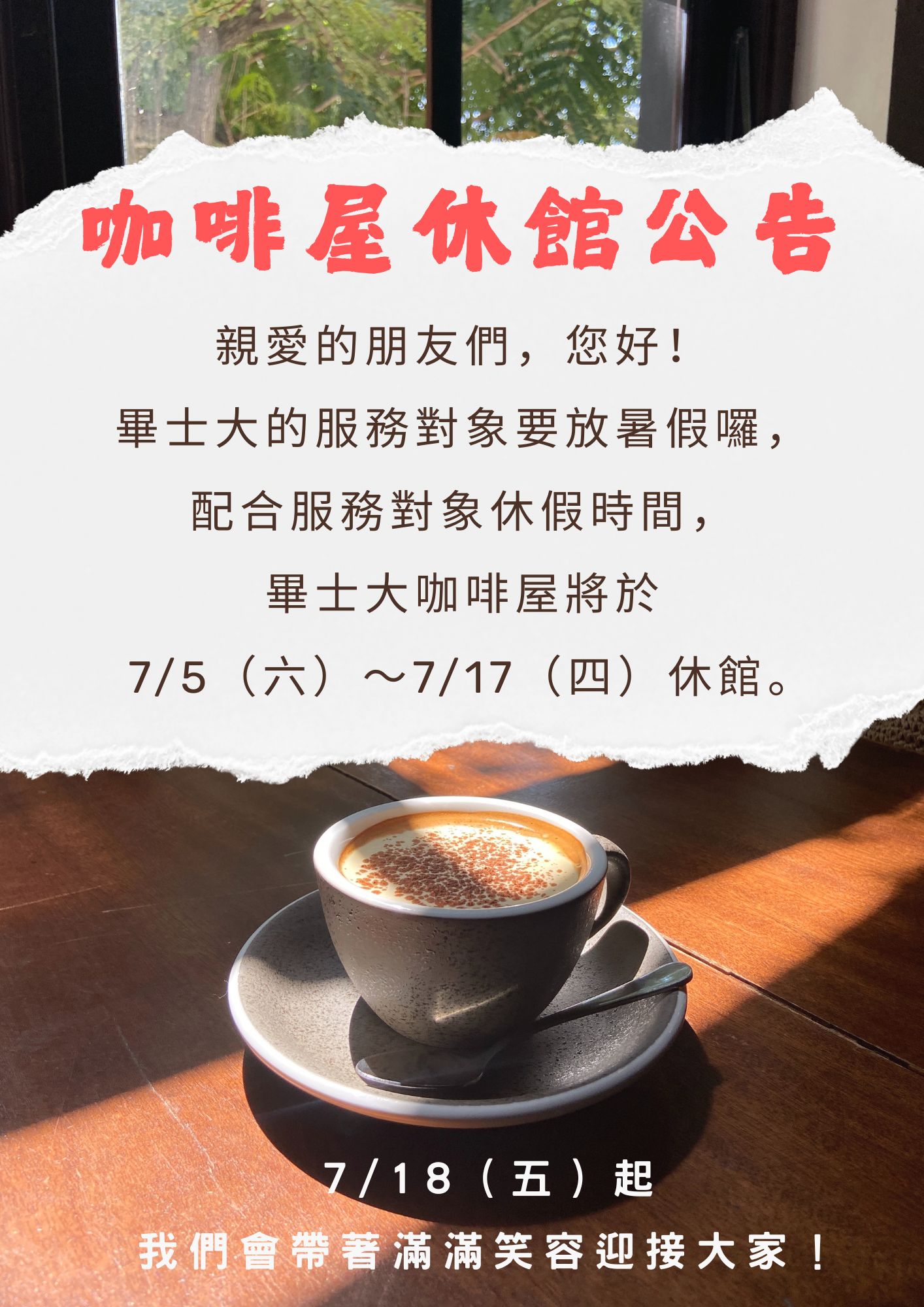 親愛的朋友們,您好! 畢士大的服務對象要放暑假啦! 配合服務對象休假, 及咖啡屋通用空間改善工程, 畢士大咖啡屋將於 7/5(六)~7/17(四)暫停營業。 #0718與您見面 小小的暫別,是為了更美好的重逢~ 7/18(五)起, 我們會帶著滿滿笑容與冰涼飲品回來迎接大家! 感謝您的體諒與支持, 期待與您再相聚,共度夏日好時光 — 畢士大咖啡屋 敬上 — #畢士大咖啡屋營業時間 周一至周五 8:30-15:30 #喝咖啡 #欣賞畫作的好地方